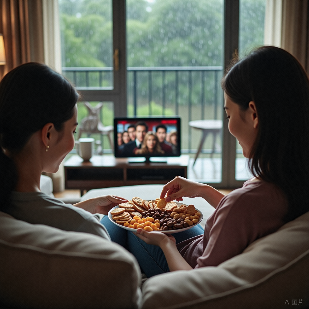 雨声成了天然的白噪音,剧情正发展到关键处,谁也没空说话。只有偶尔因为摸到同一块心仪的小饼干而指尖相碰,相视一笑,又迅速投入各自的“零食寻宝”和剧情追踪中。这一刻,窗外是湿漉漉的世界,窗内是干燥的温暖、紧凑的情节,和共享一碟零食的、无需言语的默契。疲惫的大脑,就在这咔嚓咔嚓的节奏里,得到了最熨帖的按摩。